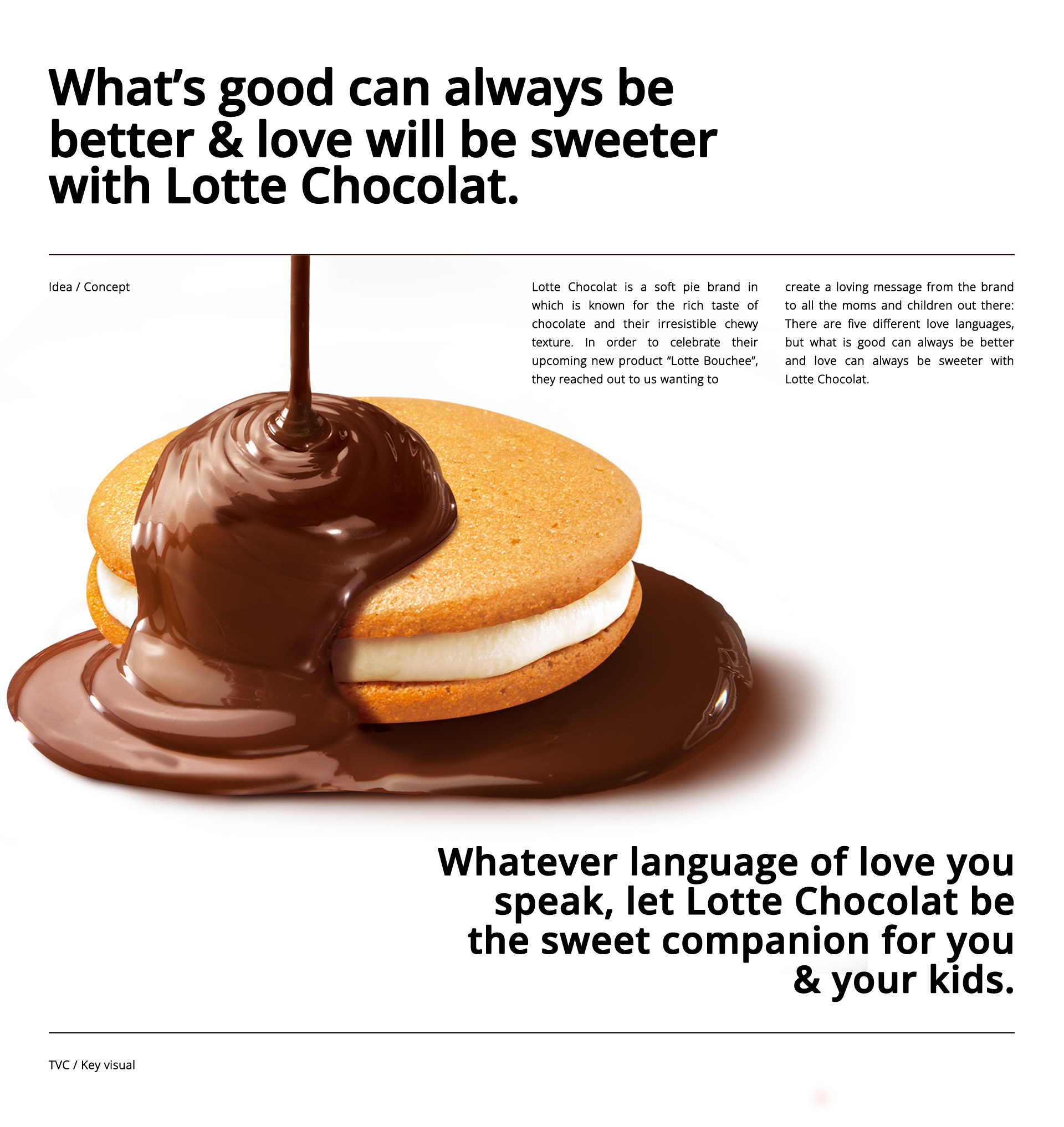 Lotte Chocolat is a soft pie brand in which is known for the rich taste of chocolate and their irresistible chewy texture. In order to celebrate their upcoming new product “Lotte Bouchee”, they reached out to us wanting to create a loving message from the brand to all the moms and children out there: There are five different love languages, but what is good can always be better and love can always be sweeter with Lotte Chocolat.